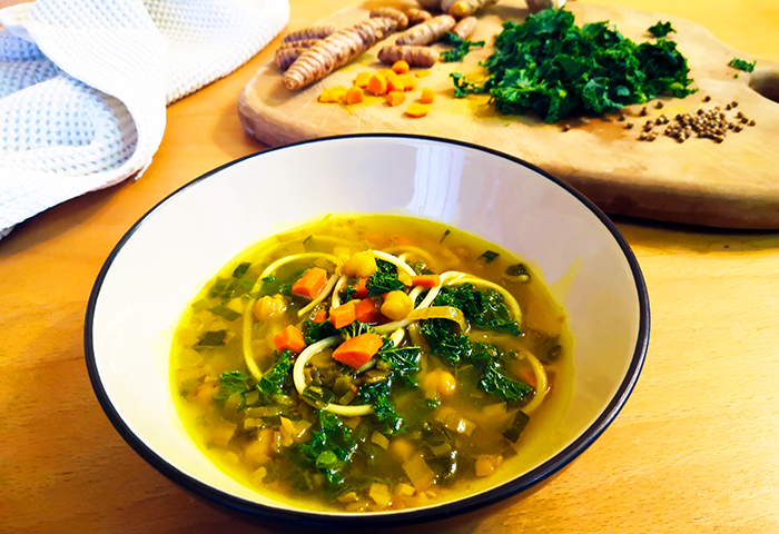 Pravzaprav juha, ki jo z riževimi rezanci ali recimo basmati-jem lahko nadgradimo v polnovredno kosilo. Z vsemi čarobnimi lastnostmi kurkume in ostalih začimb pa bomo poleg tega še zdravi in polni energije.